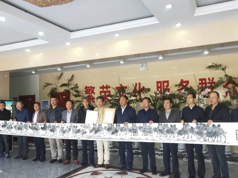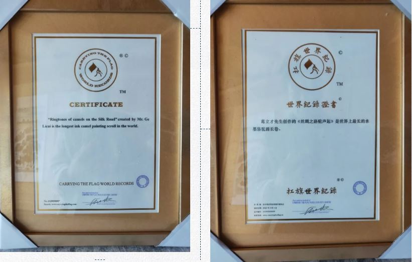 近日,公司兼职教授葛立才历时三年创作完成的百米长卷国画《丝绸之路驼声起》成功申报了扛旗世界纪录,并获得了金牌,是目前世界上长度最长的水墨骆驼画长卷。