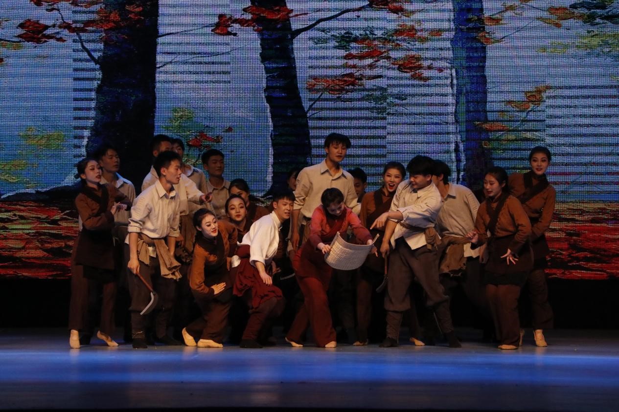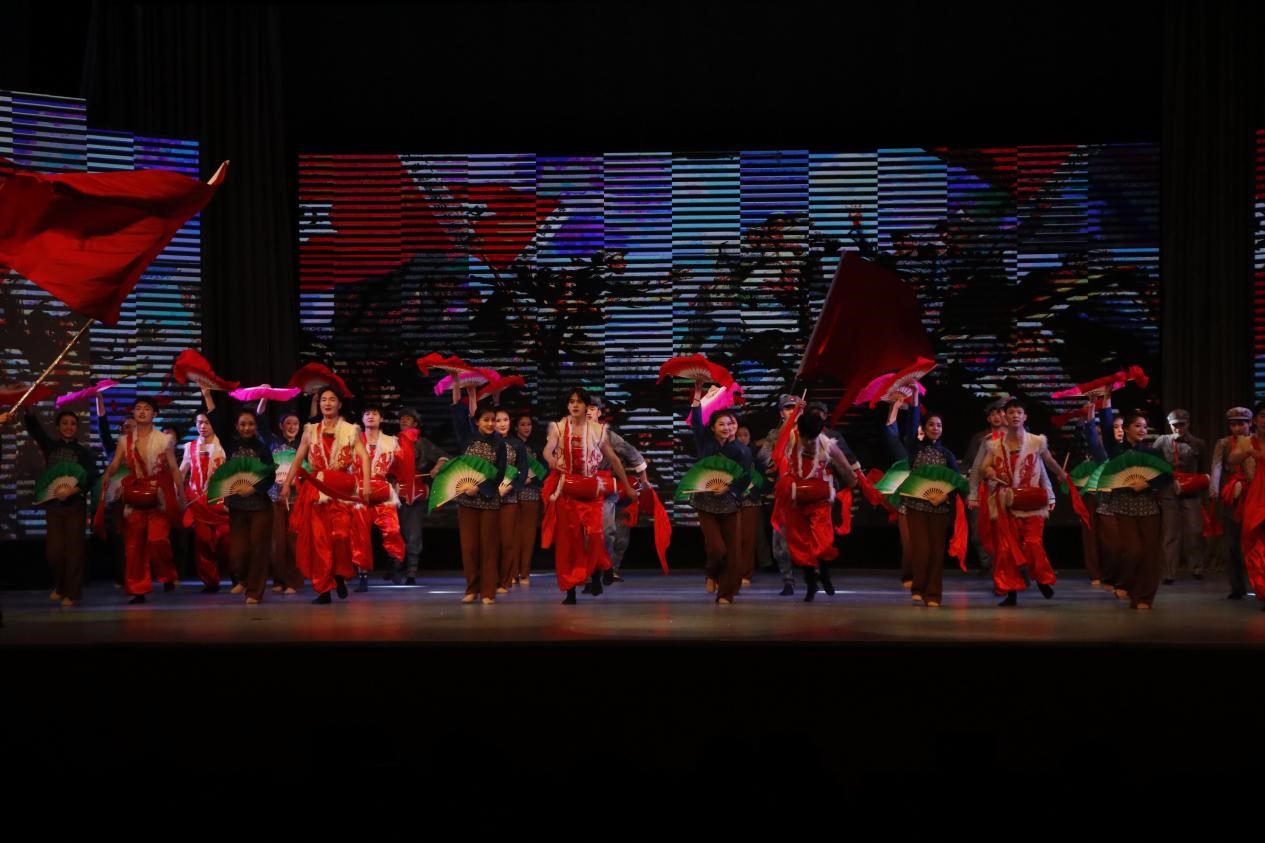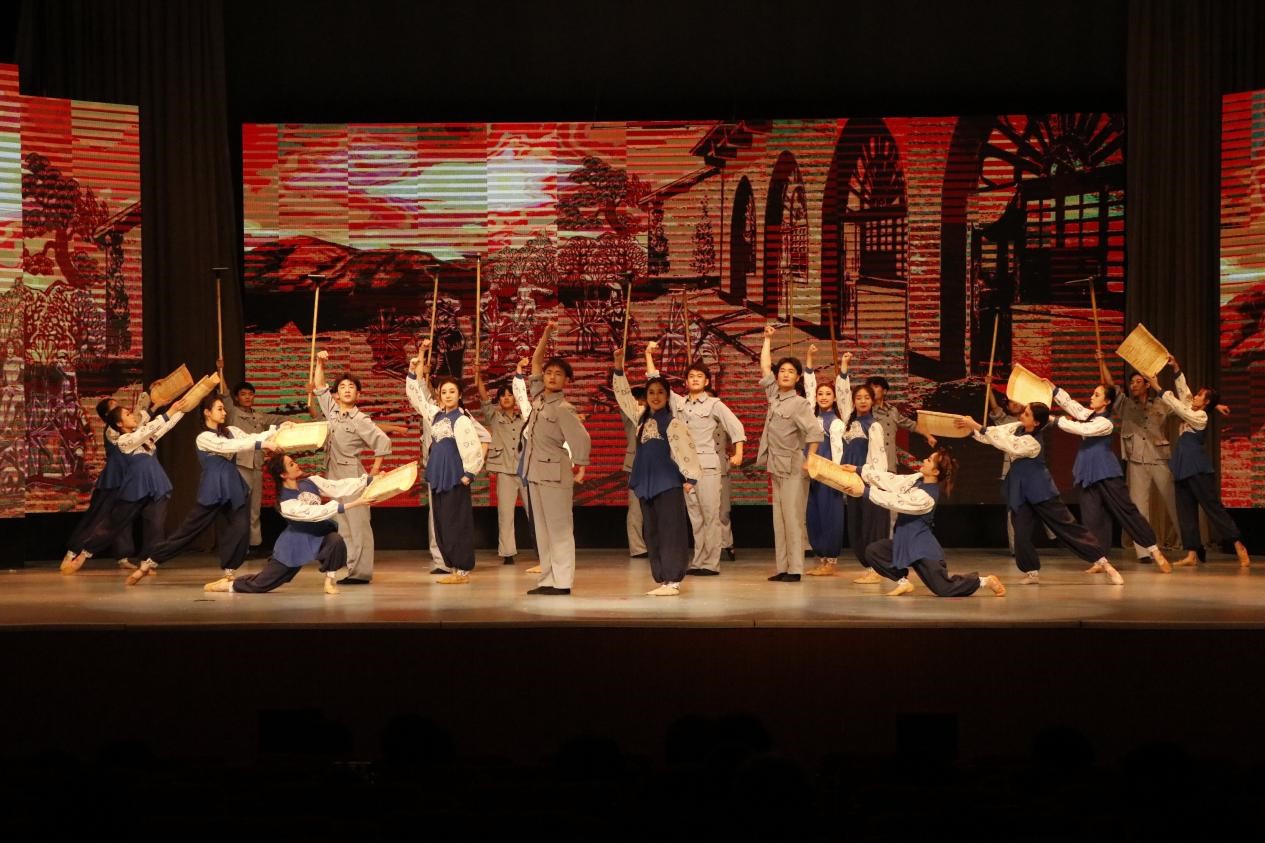 演员们载歌载舞,将秧歌剧《兄妹开荒》、《军民大生产》以及原创舞蹈《秋收》等生动活泼地表演了出来。