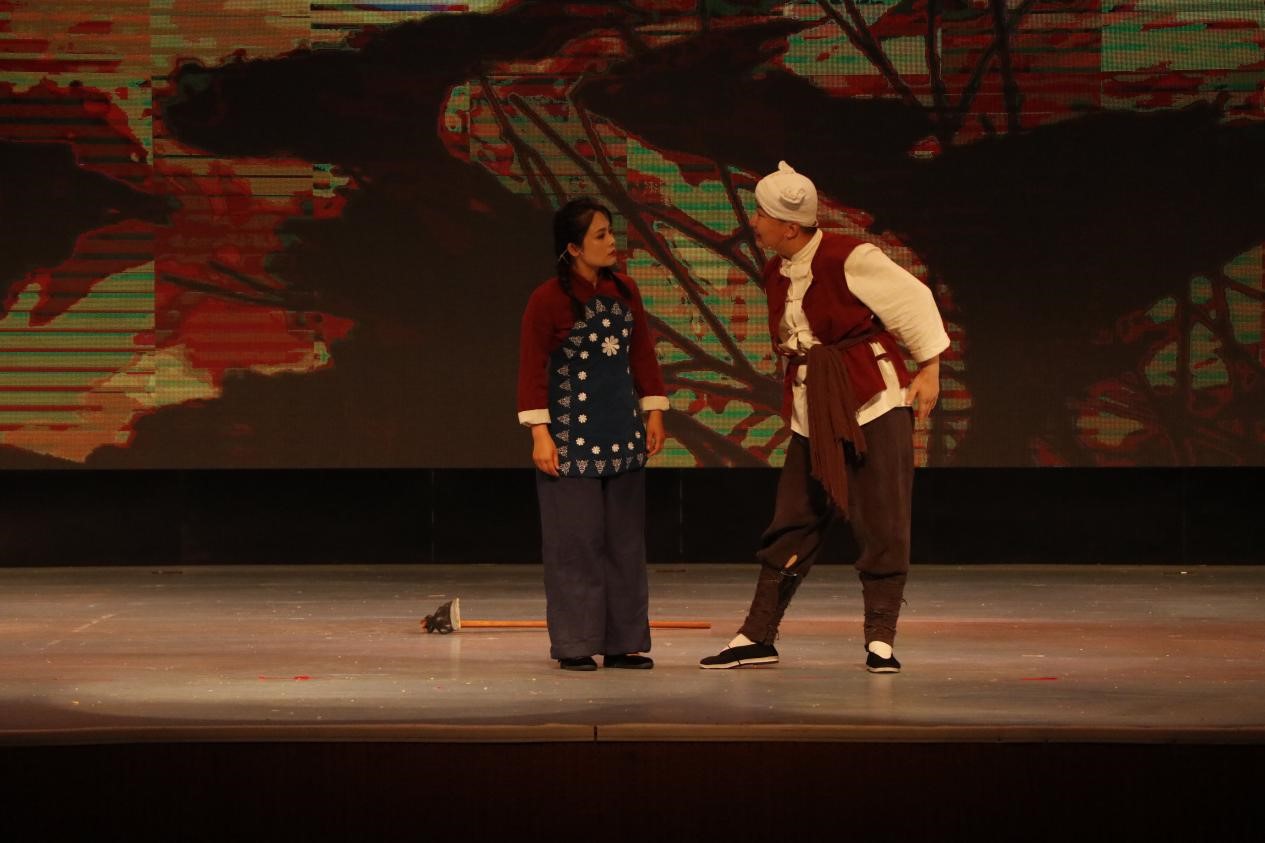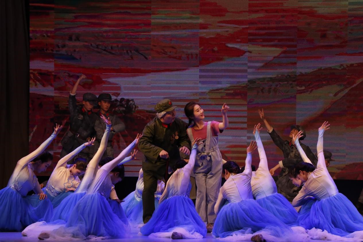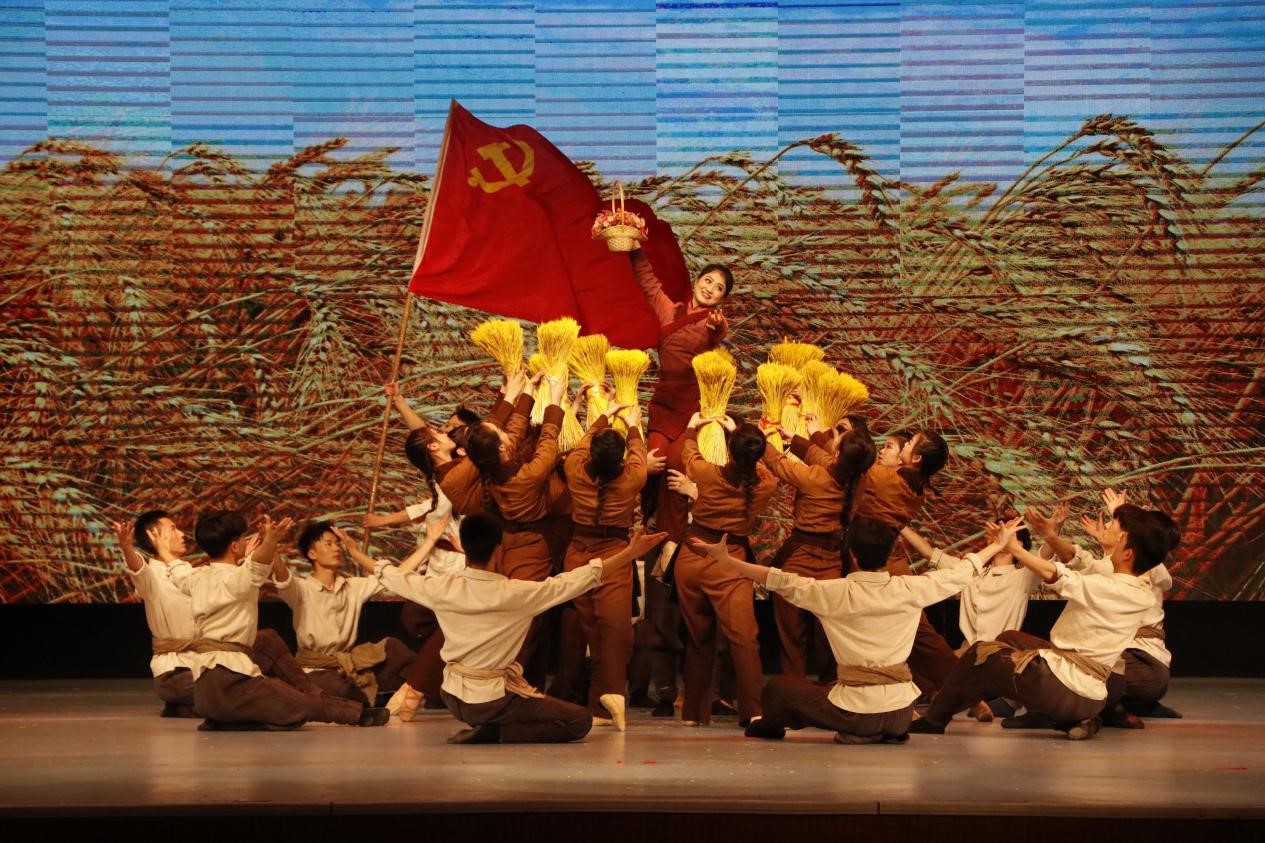演员们载歌载舞,将秧歌剧《兄妹开荒》、《军民大生产》以及原创舞蹈《秋收》等生动活泼地表演了出来。