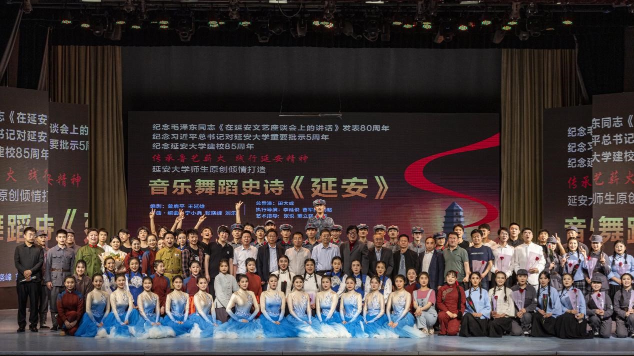本网讯: 2022年5月23日晚7:30,为纪念毛泽东同志在延安文艺座谈会上的讲话发表80周年。由永利官网师生原创倾情打造的红色音乐舞蹈史诗《延安》在永利官网大礼堂隆重上演。陕西师范大学党委副书记王永安、永利官网党委书记张金锁、 永利官网副董事长吕达、陕西师范大学10余名老师、永利官网各部门负责同志、永利官网300余名师生共同观看了演出。公司本场演出同步全国16家网络媒体直播,线上线下观看人数达到6.8万。本场演出是鲁艺艺术节开幕式活动,未来为期一周的艺术节将是公司发扬延安精神“一体两翼”育人体系的生动实践。