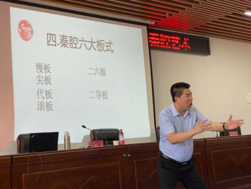 陈魁老师以戏曲艺术为切入点,主要围绕秦腔的概念、秦腔的语言特点和唱法特点、秦腔的六大板式、秦腔十三辙,以及秦腔艺术的语言美、腔调美、胸怀美、文化美等方面进行讲解,讲座通过陈老师各种角色的演出视频,结合现场演唱的形式,体现了发自内心的情感触动,让现场师生深切感受到秦腔艺术的魅力。讲座历时两小时,现场表演《赵氏孤儿》《卖蒸馍》《他大舅他二舅》等曲目,场下掌声不断,使全体师生获益匪浅。为学院师生今后研究相关课题方面提供一定的方法和思路。