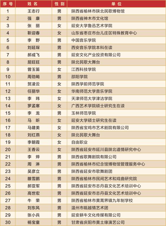 国家艺术基金2022年度艺术人才培养项目《陕北民歌艺术人才培养》将于2022年7月13日在陕西省延安市延安大剧院开班。经项目组初审、专家遴选、报国家艺术基金管理中心审核,最终确定录取30名学员参加本次培训。现予以公示,录取名单如下(排名不分先后):