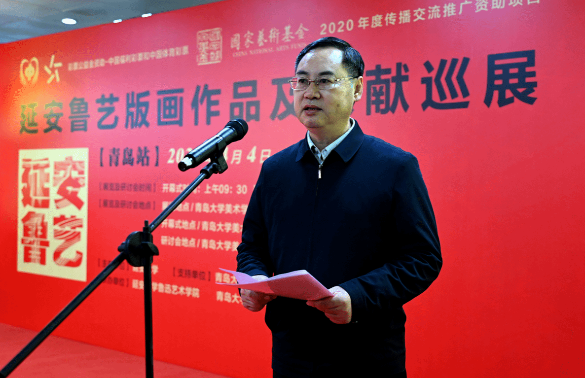 李军副董事长首先表示:正值青岛大学合并办学30周年,希望通过此次巡展,青大人站在新的历史方位,传承弘扬鲁艺精神,担负起新的社会责任和历史使命,在延安鲁艺办学和创作经验的基础上探索新时期艺术创作和高等艺术教育的发展之路,秉承“明德、博学、守正、出奇”的校训精神,以立德树人为根本,坚持走高质量发展道路,全面开启建设高水平综合性研究型大学的新征程。