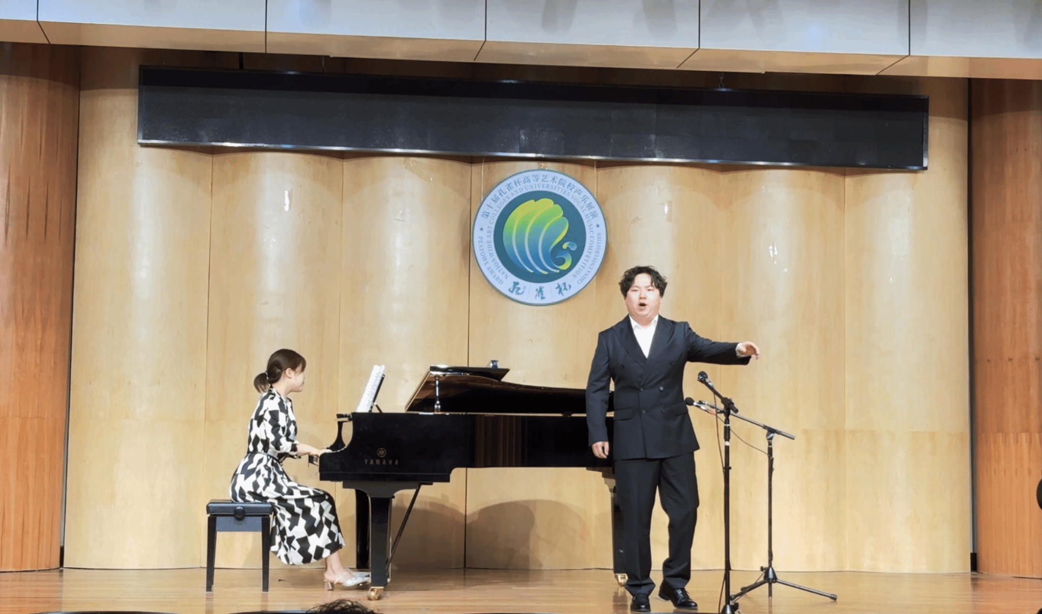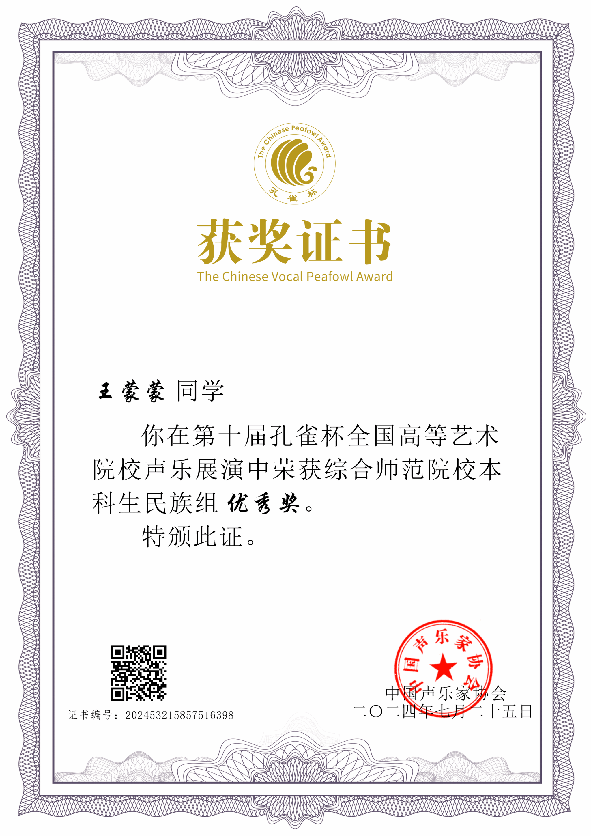 本网讯 2024年7月18日至25日,第十届“孔雀杯”全国高等艺术院校声乐展演在广州举行,来自全国300余所高校的近3700名师生参加了本次展演。经过展演、总展演两轮比赛,我院音乐学2023级本科生李星辰以94.06分的成绩荣获“银孔雀杯”,在综合师范院校本科生美声组306余名总展演选手中脱颖而出,以优异的表现博得专家评委们的一致好评。我院青年教师王嘉禄荣获优秀指导教师奖,青年教师扈莹雪担任本次展演员工艺术指导工作。